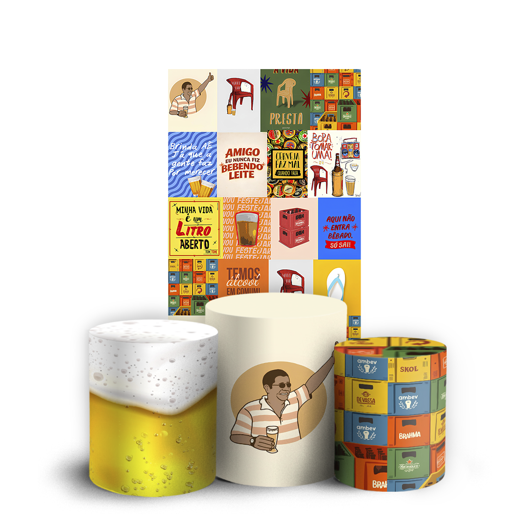 Itens do KIT: 1 Faixa Lateral Vest Facil: 150larg x 200altura em centimetros. 1 Trio Cilindro: G= 80alt x 50larg, M= 58alt x 44larg, P= 45alt x 38larg. Capa sublimada de painel redondo e trio cilindro, confeccionados em tecido helanca 225g, 100% poliéster, com acabamento em elástico. Observação: Não inclui estrutura ou suporte.