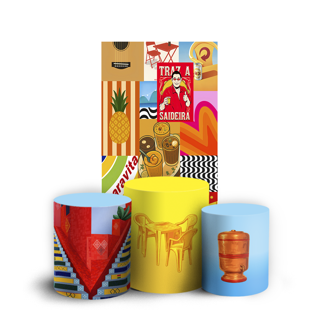 Itens do KIT: 1 Faixa Lateral Vest Facil: 150larg x 200altura em centimetros. 1 Trio Cilindro: G= 80alt x 50larg, M= 58alt x 44larg, P= 45alt x 38larg. Capa sublimada de painel redondo e trio cilindro, confeccionados em tecido helanca 225g, 100% poliéster, com acabamento em elástico. Observação: Não inclui estrutura ou suporte.