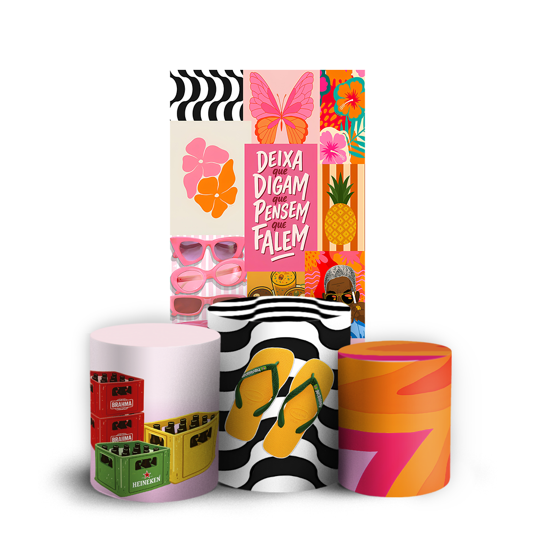 Itens do KIT: 1 Faixa Lateral Vest Facil: 150larg x 200altura em centimetros. 1 Trio Cilindro: G= 80alt x 50larg, M= 58alt x 44larg, P= 45alt x 38larg. Capa sublimada de painel redondo e trio cilindro, confeccionados em tecido helanca 225g, 100% poliéster, com acabamento em elástico. Observação: Não inclui estrutura ou suporte.