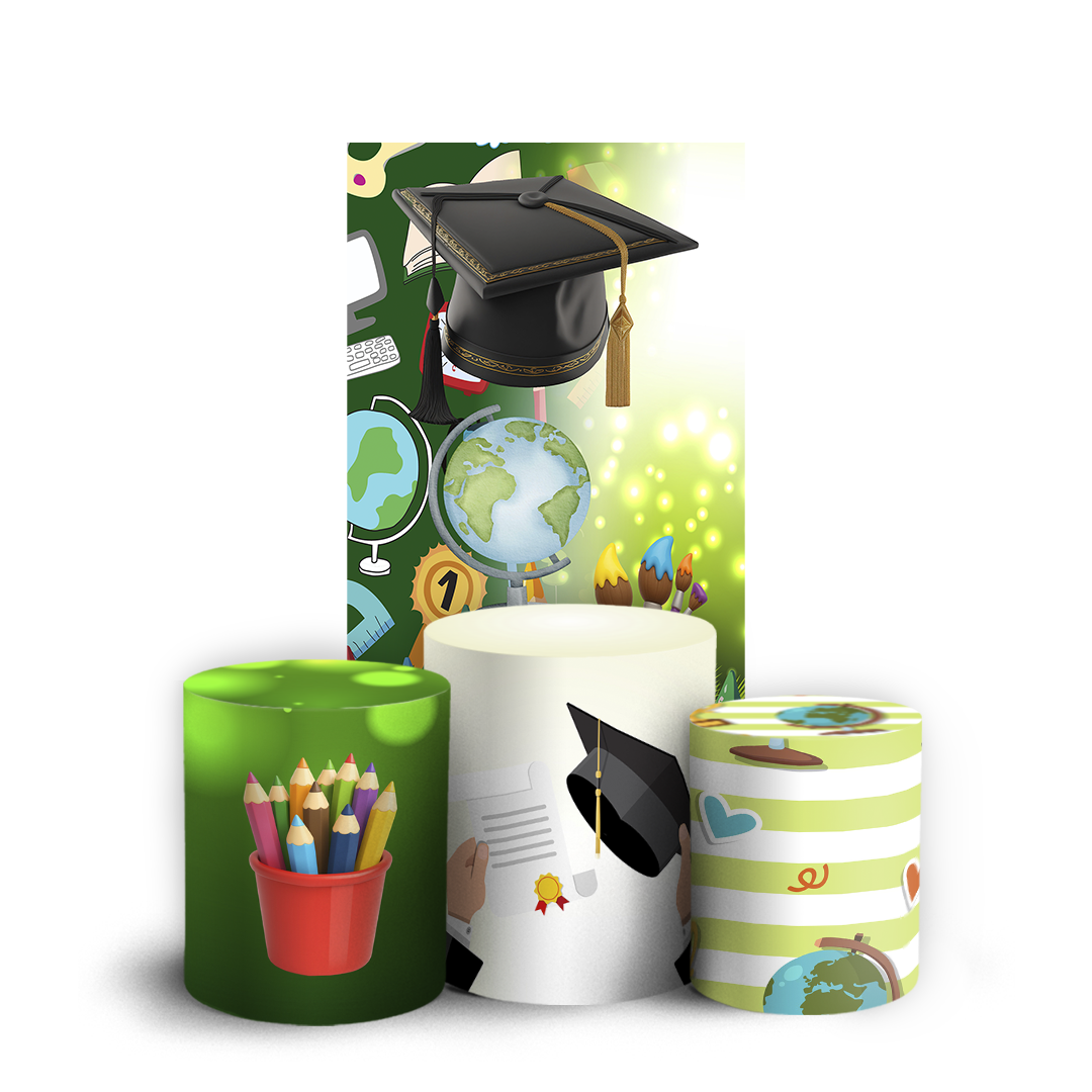 Itens do KIT: 1 Faixa Lateral Vest Facil: 150larg x 200altura em centimetros. 1 Trio Cilindro: G= 80alt x 50larg, M= 58alt x 44larg, P= 45alt x 38larg. Capa sublimada de painel redondo e trio cilindro, confeccionados em tecido helanca 225g, 100% poliéster, com acabamento em elástico. Observação: Não inclui estrutura ou suporte.