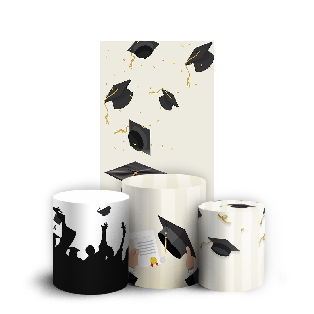 Itens do KIT: 1 Faixa Lateral Vest Facil: 150larg x 200altura em centimetros. 1 Trio Cilindro: G= 80alt x 50larg, M= 58alt x 44larg, P= 45alt x 38larg. Capa sublimada de painel redondo e trio cilindro, confeccionados em tecido helanca 225g, 100% poliéster, com acabamento em elástico. Observação: Não inclui estrutura ou suporte.