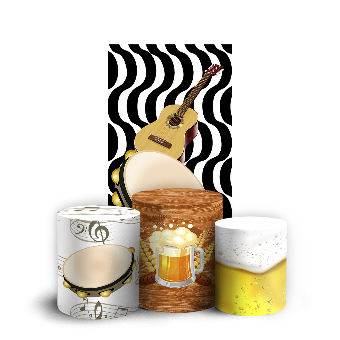 Itens do KIT: 1 Faixa Lateral Vest Facil: 150larg x 200altura em centimetros. 1 Trio Cilindro: G= 80alt x 50larg, M= 58alt x 44larg, P= 45alt x 38larg. Capa sublimada de painel redondo e trio cilindro, confeccionados em tecido helanca 225g, 100% poliéster, com acabamento em elástico. Observação: Não inclui estrutura ou suporte.