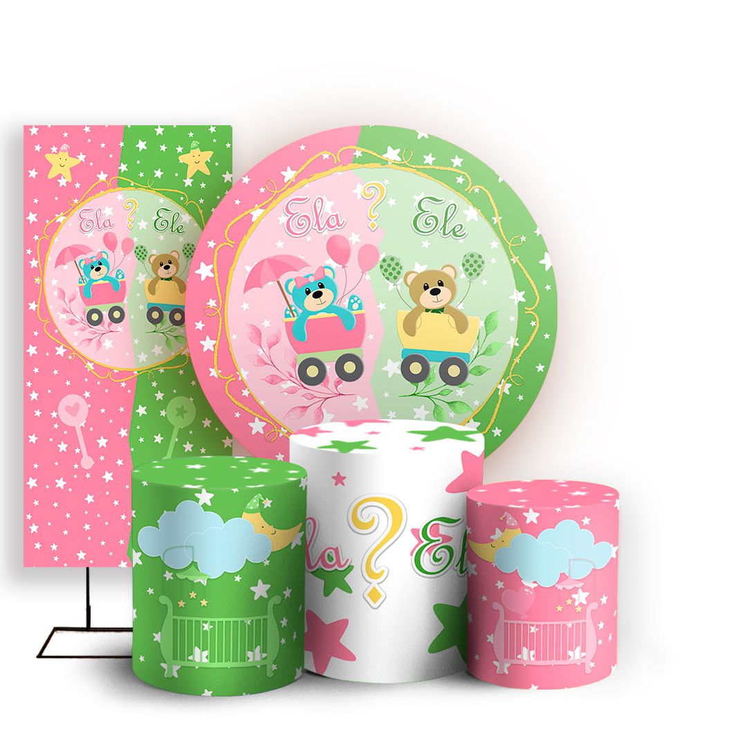Itens do KIT: 1 Painel Redondo de 150cm. 1 Trio Cilindro: G= 80alt x 50larg, M= 58alt x 44larg, P= 45alt x 38larg. 1 Faixa Lateral de 100larg x 200alt.