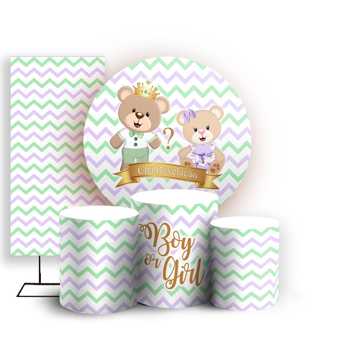 KIT Redondo Trio e Faixa - Ursinhos Chá Revelação - Sublimado 3D